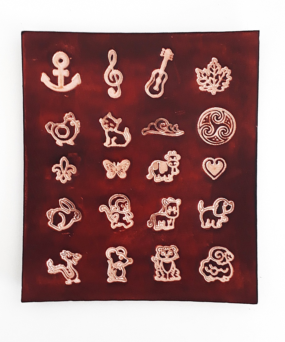 dragon, mouton, feuille, cheval, ancre marine, feuille losange, coeur, triskell, papillon, chat, feuille ornementale allongée, clé de sol, chien, tigre, singe, lapin, souris, guitare, 2 motifs différents ou bien sans aucun motif